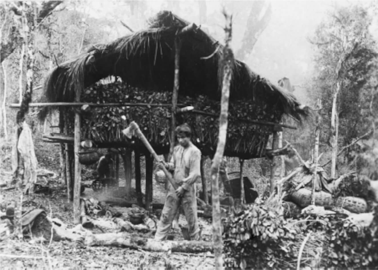 Os colonos que chegavam a região dedicavam-se fortemente as atividades agropecuárias, para as quais, via de regra, derrubavam a mata e também os ervais, ainda que entre alguns deles a atividade ervateira também estivesse presente como mecanismo complementar da renda agrícola (Gerhardt, 2011, 2013). Na Foto 2 pode-se observar parte do cenário de avanço da colonização, em que é registrado o descanso de um colono sob um tronco de árvore da floresta que está sendo derrubada. A intensa luz natural que o ilumina contrasta com a face obscura da floresta, no plano de fundo, que precisa ser “vencida” para viabilizar o avanço das famílias, através da constituição de lavouras, a edificação de casas e galpões e a instalação de novas atividades produtivas, como a construção de olarias, Foto A1 (anexo online).