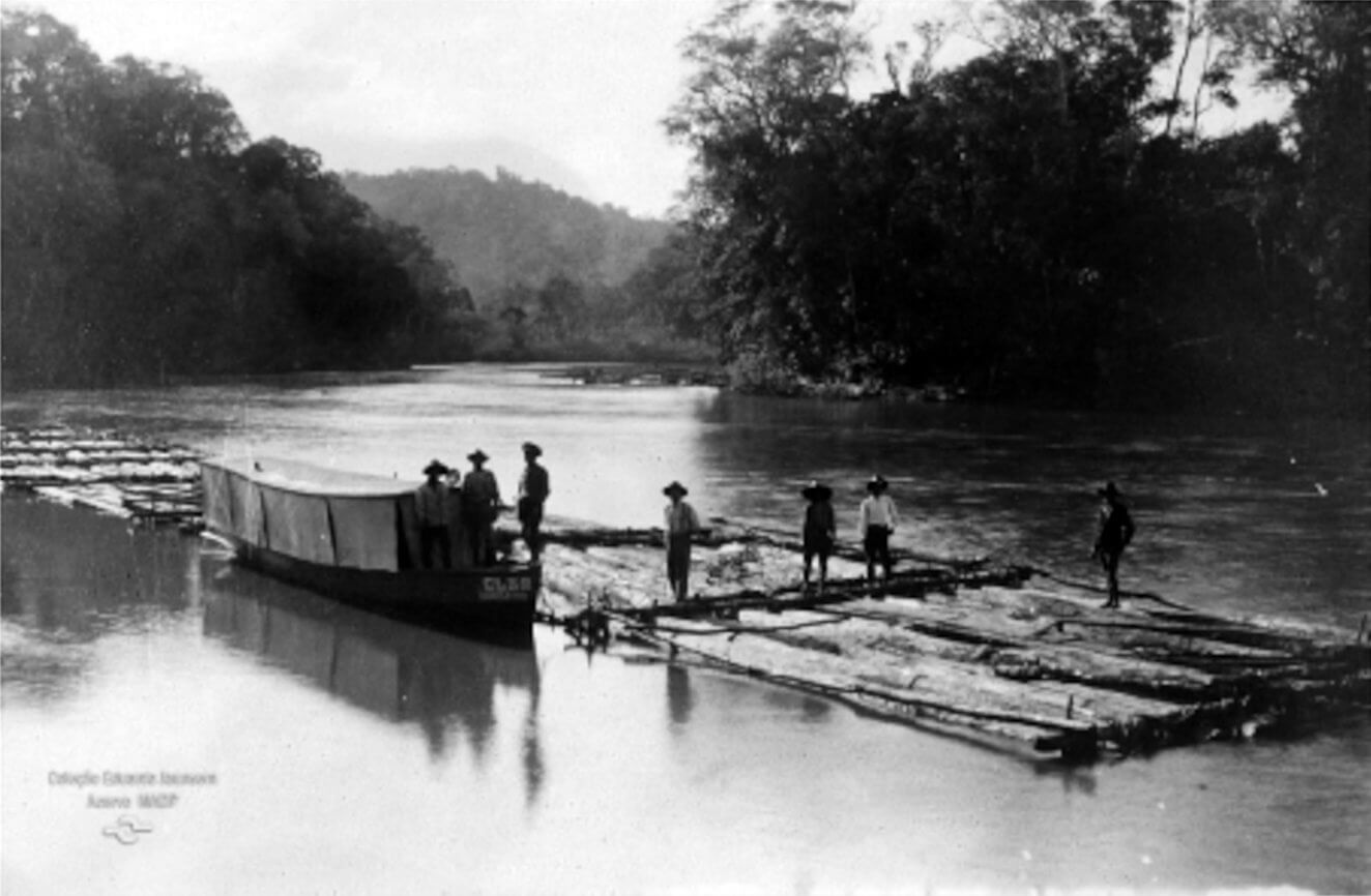 Entre as décadas de 1940 e 1960 houve intensa comercialização de madeira destinada para os mercados platinos (Buenos Aires e Montevidéu) e também para a Europa, onde ocorreu aumento da demanda após o final da Segunda Guerra Mundial. A Foto 7 apresenta a cena de uma balsa, formada por diversas toras amarradas umas às outras, que eram transportadas através do rio Uruguai. Isso também impulsionou o trabalho das serrarias e gerou um curto ciclo econômico de exportação de madeira via rio Uruguai, que teve seu auge entre os anos de 1940 e 1950, findando nos anos 1960, em função do esgotamento da disponibilidade de madeira e da existência de melhores estradas e caminhões (Santos, 2005).