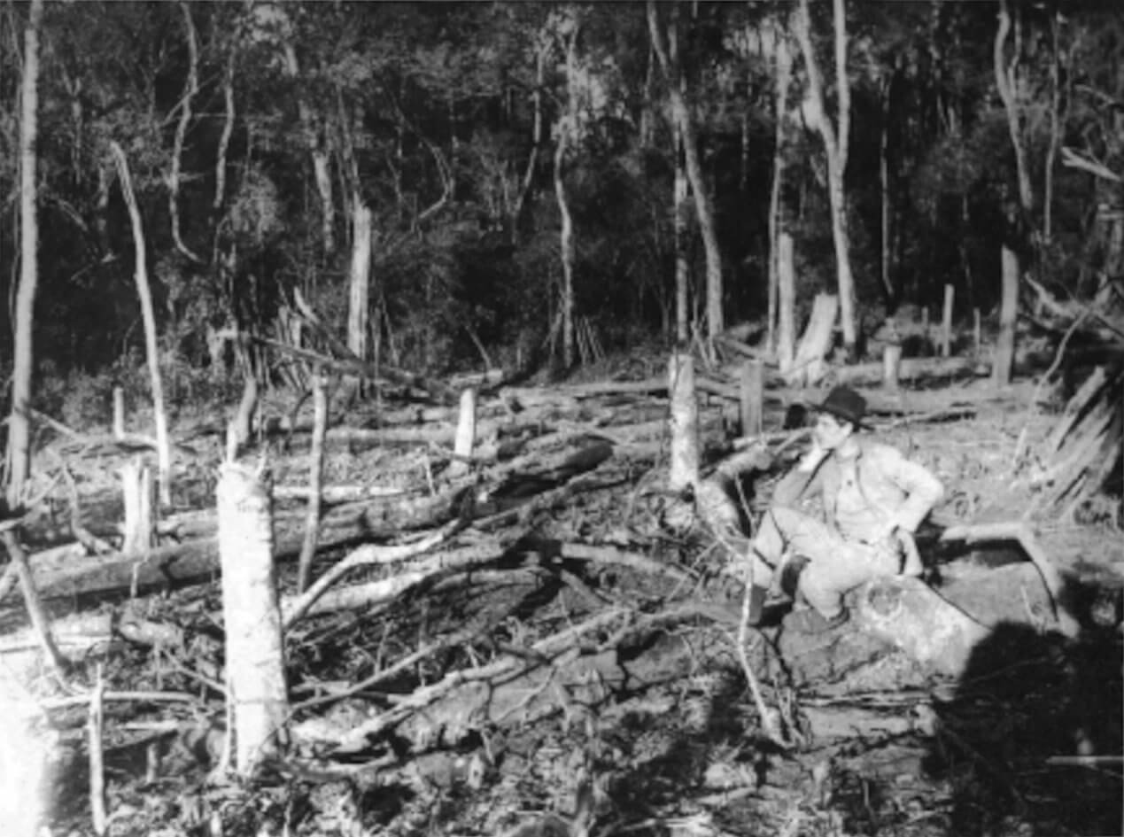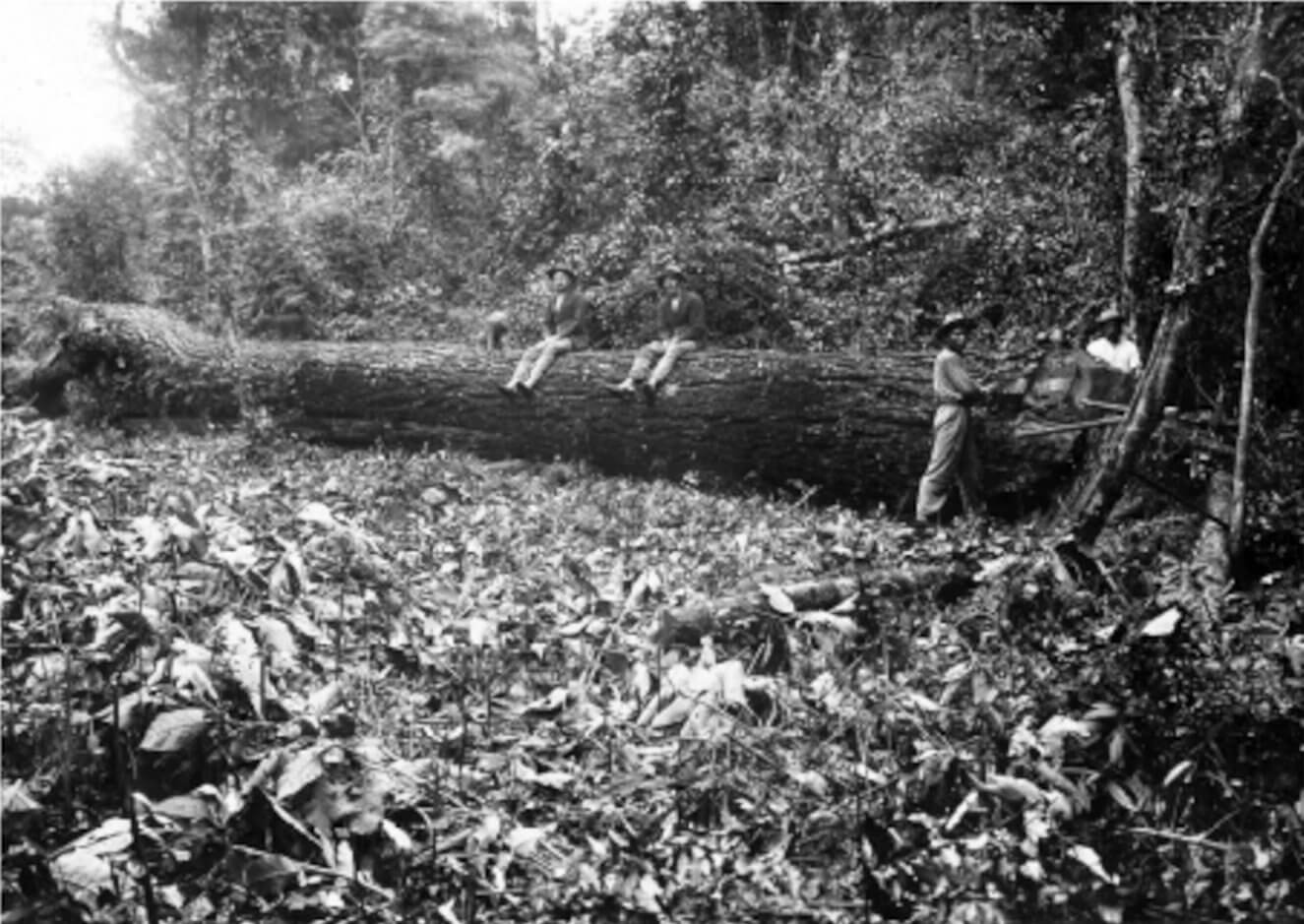 De acordo com Conti e Miguel (2014), entre 1910 e 1940 foi intensa a chegada de colonos na área do COREDE-FN. Esses agricultores se dirigiam às novas colônias onde buscavam as terras mais escuras e férteis das florestas (bioma Mata Atlântica), evitando as terras mais vermelhas, com capim barba-de-bode (Aristida, sp.) e presença de formigas cortadeiras, bastante presentes no bioma Pampa, além do que, estes espaços de campo não estavam mais disponíveis, pois eram ocupados por poderosos fazendeiros criadores de gado (Zarth, 1997). Bernardes (1997) argumenta que os imigrantes e seus descendentes eram direcionados para as áreas de matas, onde as colônias eram instaladas. Colonizar e desmatar eram sinônimos. A expansão das colônias cessava onde iniciavam as zonas de campos. As fotos registram o cotidiano do árduo trabalho de derrubada da floresta. Utilizando ferramentas manuais, especialmente machados e serras de metal, lenta e continuamente a floresta, escura e grandiosa, que miniaturizava e tornava as pessoas pouco perceptíveis (Foto 4), foi sendo iluminada e apequenada pela ação humana, o que faz aumentar a centralidade das pessoas, que se agigantam frente a floresta, que vai perdendo espaço na paisagem (Foto A2, anexo online).