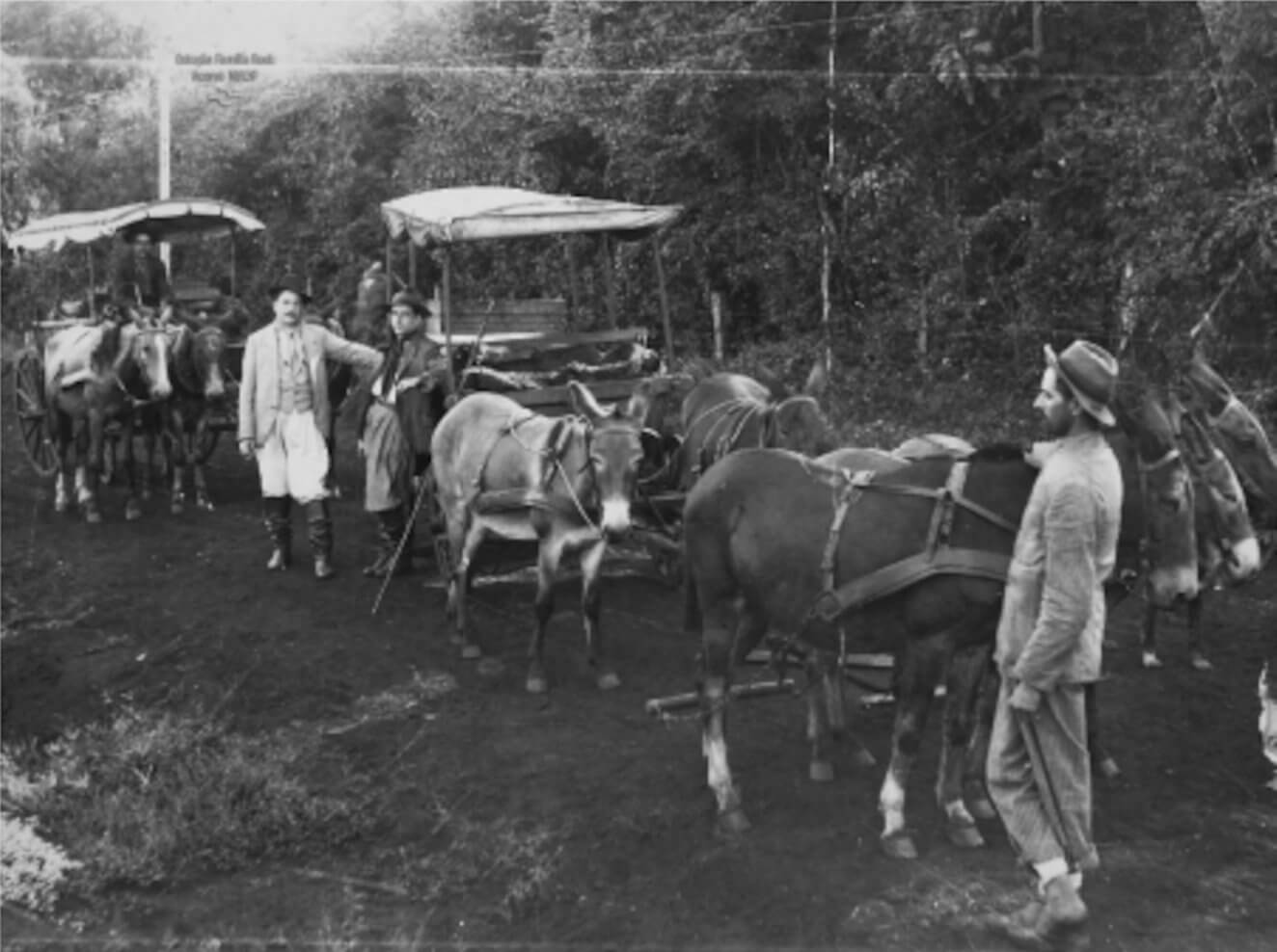 Antes da chegada da estrada de ferro o transporte das mercadorias era realizado com uso de carroças tracionadas por mulas, cavalos ou bois. Na Foto 3 observa-se o registro de vendedores ambulantes, denominados de caixeiros viajantes, que circulavam pela região transportando as mercadorias, estando limitados pela capacidade de carga e velocidade dos meios de transporte com tração animal. Esse cenário é sensivelmente alterado com a chegada da estrada de ferro em Santa Rosa, no ano de 1940, o que acelerou a integração da região às dinâmicas nacionais.
