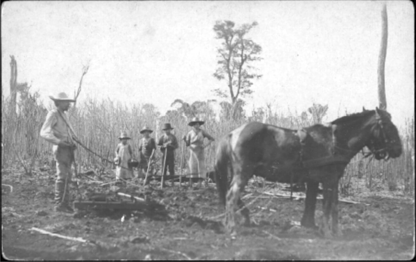 Segundo Machado (2001), o sistema agrário colonial era baseado no trabalho agrícola familiar e em mutirões, para o desenvolvimento da agricultura de derrubada e queimada. Após a derrubada da mata ela era queimada e posteriormente se realizava o plantio. Na Foto 5 pode-se observar o trabalho de preparo do solo, após a derrubada e queimada da floresta. No primeiro plano observa-se o colono e a grade atrelada a uma parelha de cavalos. No último plano da imagem, a emblemática presença dispersa de poucas árvores, algumas sem galhos e folhas, o que as destaca como reminiscências da grandiosidade perdida pela floresta.