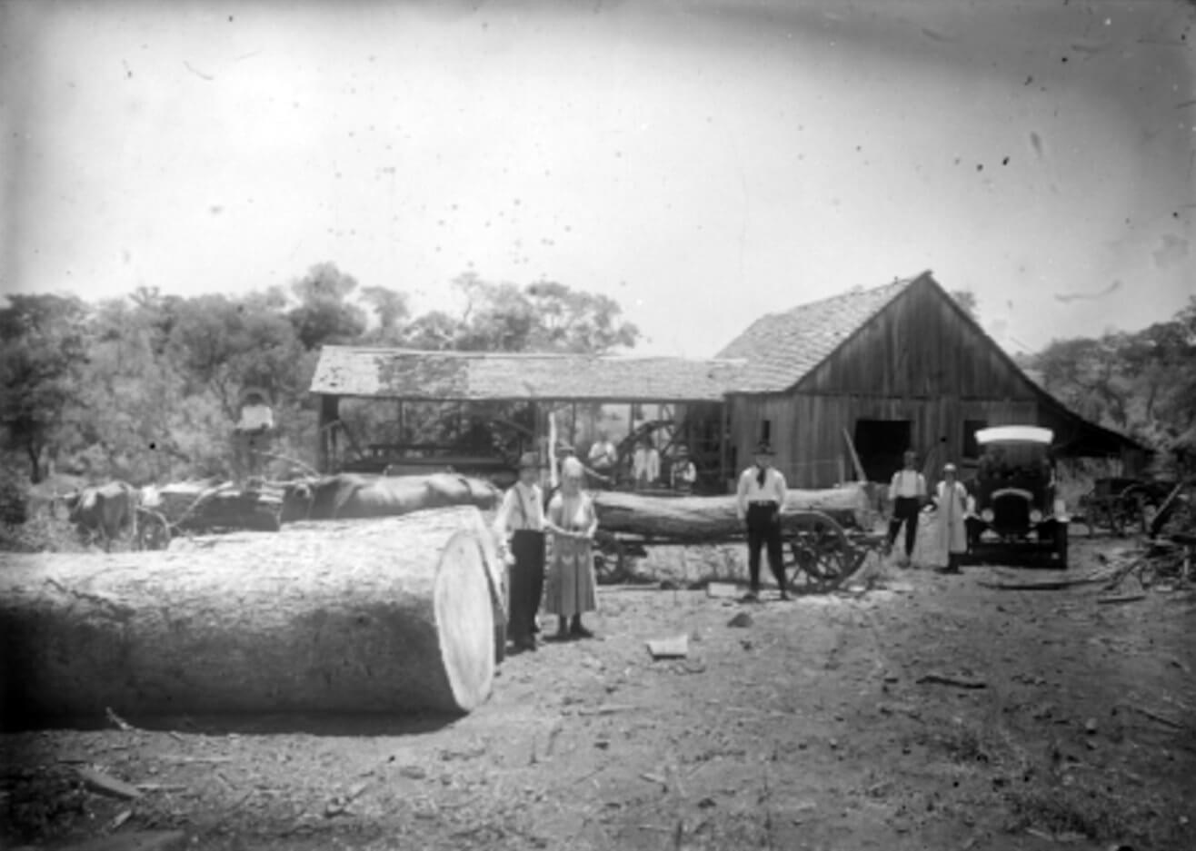 No período inicial, que envolvia a derrubada da floresta, a produção de madeira foi bastante relevante, tanto para uso nas construções das próprias casas e galpões, como para o comércio. Na Foto 6 observa-se o cenário de uma serraria de madeira, muito presente durante o processo de ocupação colonial da região. No plano de fundo pode-se constatar o uso da madeira para a edificação da própria serraria, que impõe-se na paisagem secundarizando a floresta, que aparece de modo tangencial e secundário na imagem. O paralelismo das toras sob o solo e a carroça conduz o olhar até um automóvel que, postado em frente à entrada da serraria, parece ser exibido como um troféu, obtido com o trabalho na serraria.