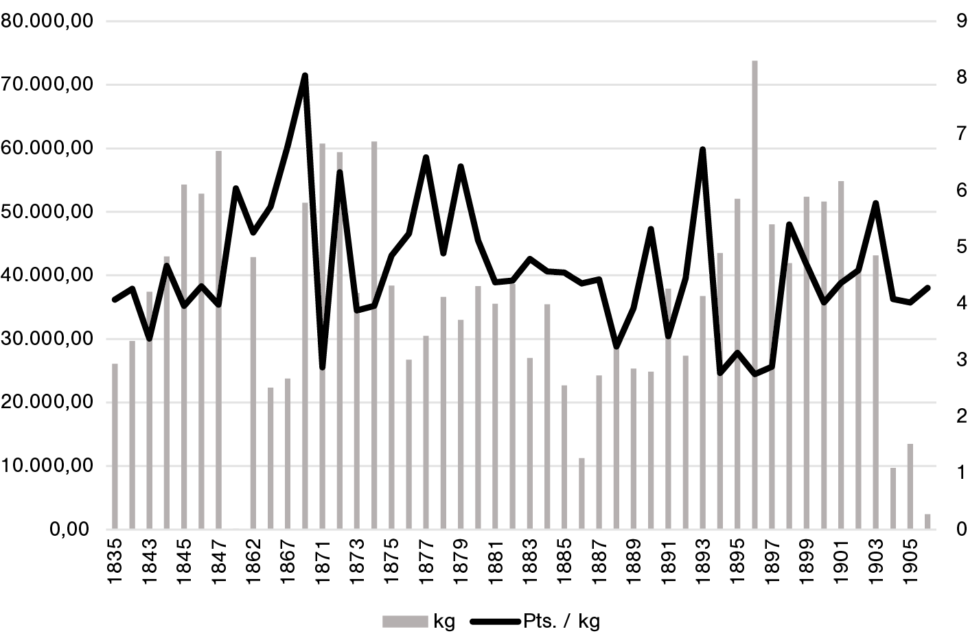 Así pues, la materia prima empleada en la fábrica de Vinalesa procedía de los capullos obtenidos, a pequeña escala, por miles de campesinos dedicados a la cría de gusanos. Sobre ellos se produjo el impacto más directo de la pebrina en 1854, como muestra el hundimiento de las compras de Trenor y Cía. recogido en el Gráfico 1. Durante unos años, llegó muy poca producción a la fábrica y la cifra alta de algún año aislado se debió a compras en el exterior. En cuanto a los precios, parecen haber sido menos estables que antes de la epidemia: hubo alzas puntuales que duplicaron los valores medios, especialmente en los años de inicio de la recuperación, cuando la producción debía recurrir a simiente importada. Por el contrario, también hubo años de hundimiento de la cotización14. Al final de la serie, la tónica de los precios coincide con la caída de las compras, en un momento en que la producción de capullo estaba siendo desplazada en el campo por otros cultivos.