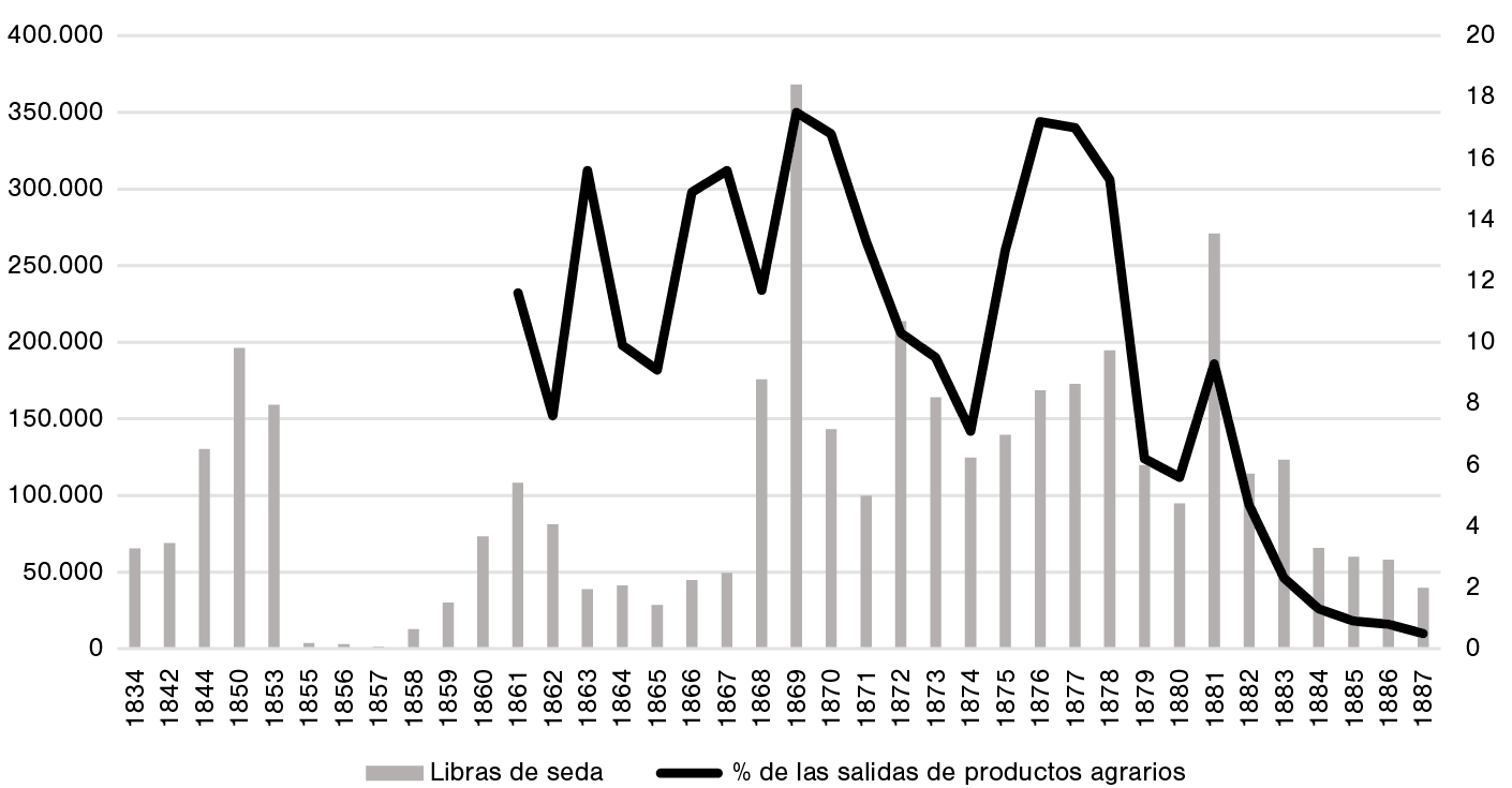 Hacia finales del siglo xix, España ocupaba un lugar muy modesto en la producción mundial de seda. En el quinquenio 1875-1879, la media fue de 426 quintales de hilo frente a los 8.580 de Francia o los 12.540 de Italia. Estos valores estaban muy lejos de los del pasado: a finales del siglo xviii, la producción española era de 5.400 quintales y todavía en 1833 alcanzó los 11.500, superando a Francia, aunque lejos de Italia (Federico, 2009: 202, 204-205). Por aquellas fechas, la seda era la principal partida de las exportaciones valencianas y representaba una cuarta parte de ellas (Piqueras, 1985: 22). Sin embargo, a finales del xix, los envíos de seda ocupaban un lugar marginal en las exportaciones.
