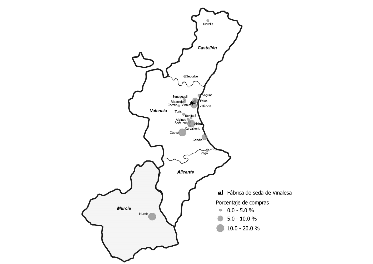 El suministro de materia prima a la planta de Vinalesa dependía de las opciones productivas de amplias zonas rurales y estas habían venido modificándose sustancialmente desde la crisis de la pebrina. El mapa muestra la localización de agentes proveedores de la empresa, cada uno de los cuales a su vez adquiría capullo en pueblos próximos. La red abarcaba el territorio con mayor actividad sedera, que coincidía con zonas de agricultura de regadío12. La relación comercial fue muy longeva con algunos de los agentes13 y, en ocasiones, los tratos se prolongaban con sus viudas o hijos, de manera que hubo una gran continuidad en la red. Es más, algunos de los proveedores de capullo se convertirían en expendedores de guano y fertilizantes por cuenta de Trenor y Cía. en sus respectivas comarcas. Los canales de difusión de los nuevos fertilizantes se superponían, así, a las redes previas de comercialización de la producción agraria.