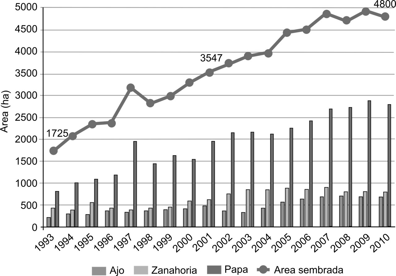 Es menester decir que las tierras de los páramos, por su condición bioclimática, son muy productivas, como es el caso del municipio Rangel, una de las principales zonas de cultivo de hortalizas en los Andes de Mérida. Como se puede observar en la Figura 5, desde los años noventa la superficie sembrada en el municipio Rangel aumentó de forma sostenida. En total, la superficie sembrada se duplicó con creces, pasando de 2.079 hectáreas a 4.800 hectáreas en solo 16 años. En el municipio Rangel los principales productos son la papa, el ajo y la zanahoria, que en 2010 representaron el 90,3% de la producción total del municipio (Smith & Romero, 2012).