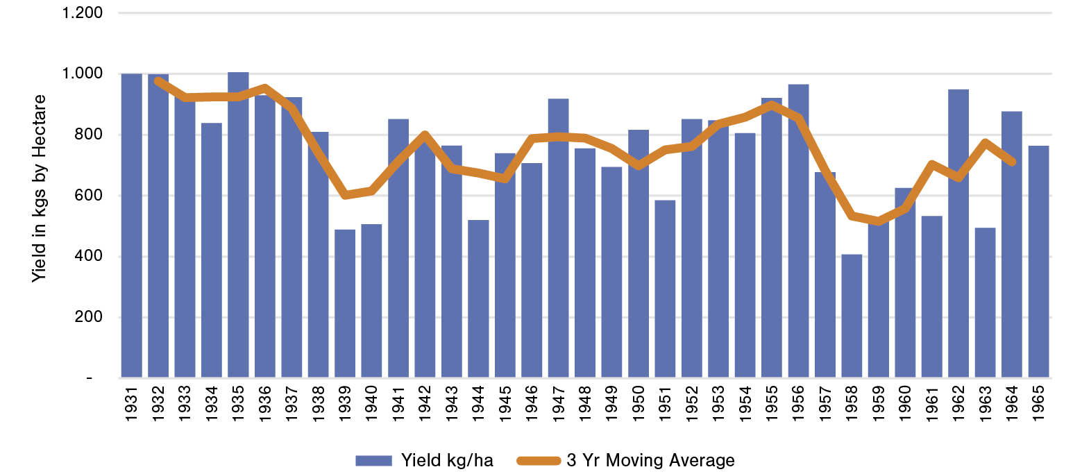 Average yield of wheat by hectare of Brazilian farmers, 1931-65