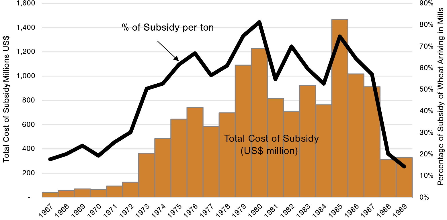 This draconian legislation was more part of basic policy under the new military rulers than a direct response to changes in US wheat exports programs. Their aim was to reduce the cost of food, through direct subsidies to the consumer; stimulating domestic production and reducing imports which were a heavy burden on the balance of payments. As the cost of domestic production was usually higher than the cost of imports, the government acted to reduce those costs. As the sole buyer of domestic and imported wheat, the government sold the wheat to the mills below their purchase costs and set prices at all stages of the production process. But the costs were high and so the government invested major sums to increase the productivity of domestic wheat.