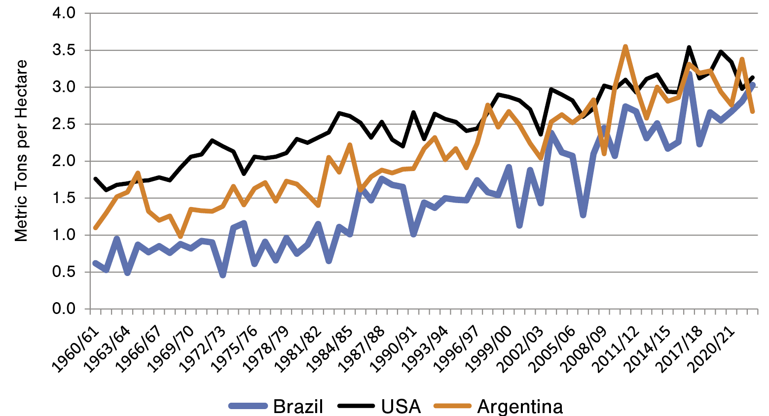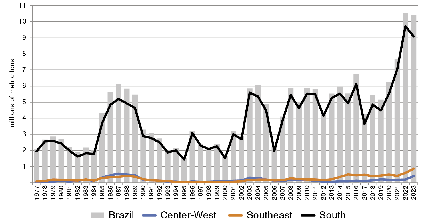 Currently Brazil is one of the largest producers and exporters of agricultural products in the world, participating actively in the international agrobusiness market in numerous products such as soybeans, corn, cotton, orange juice, cellulose, and animal proteins (Klein & Luna, 2023). Yet one product has never fully satisfied even local consumption despite its ever-growing importance in the national diet. Wheat and wheat flour have been imported since the early 19th century, and from then until today have represented Brazil largest agricultural import, accounting for 29% of all food imports in 20231. Wheat became increasingly consumed in Brazil after the late-19th century arrival of millions of Italian and Spanish immigrants, who were among the highest per capita consumers of wheat in Europe (Collins, 1993: 23). To satisfy this increasing demand, the various governments since the late 19th century have encouraged wheat production as much as possible. This has involved both costly market interventions which were later abandoned, and significant research investments in new seeds and methods of production to compensate for the relatively negative environment for production. Wheat is traditionally produced in northern or southern temperate climates, but rarely in semi-tropical and tropical regions like Brazil. Yet by 2023 Brazil was finally producing 56% of Argentine production2, the leading South American producer. It was also progressively moving toward self-sufficiency in the past few decades and even producing a modest level of exportations.