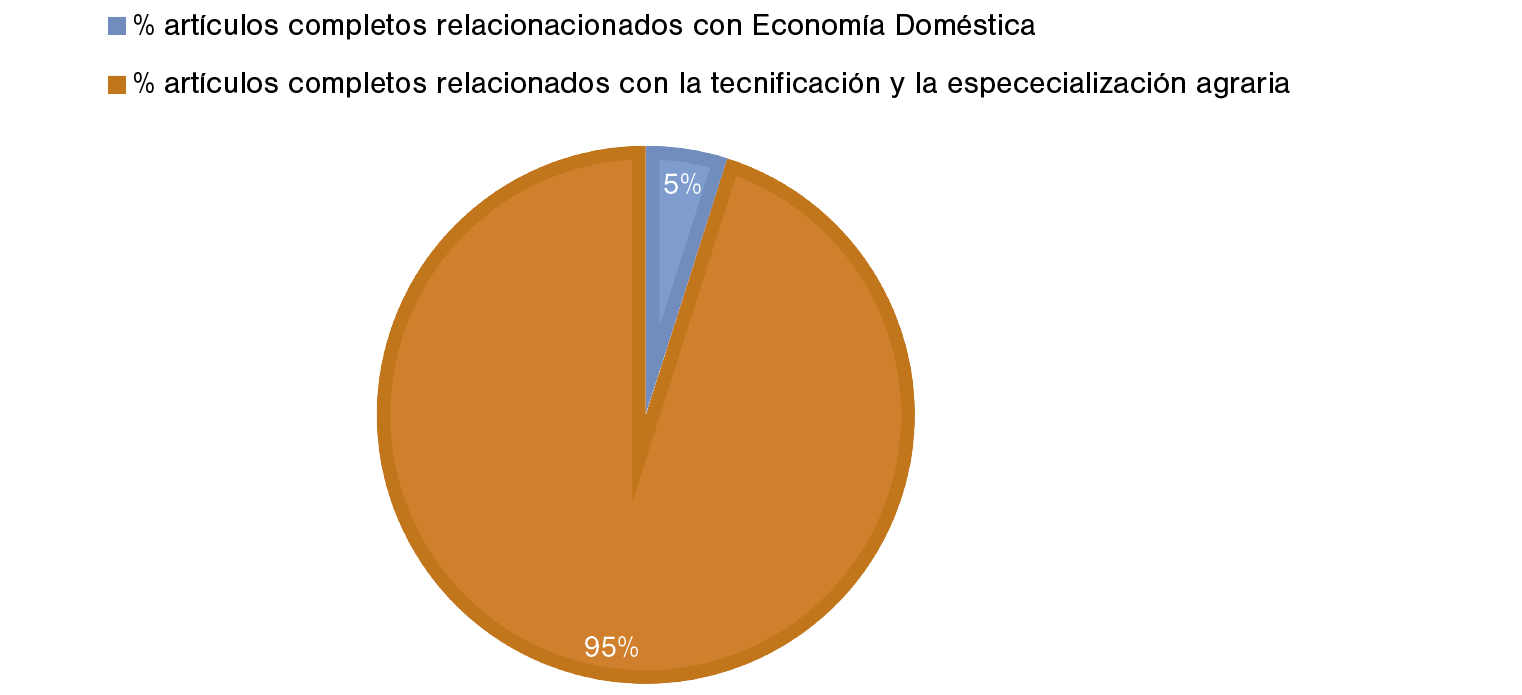 Del total de publicaciones, artículos y secciones de la REA entre 1961 y 1965, tan solo el 5% estaban relacionados con la economía doméstica y la capacitación femenina rural, mientras que el 95% estaban dirigidos a la enseñanza de los nuevos métodos y procedimientos de tecnificación y especialización agraria que redundaría en el aumento de la productividad, tal y como se puede constatar en la Gráfica 4.