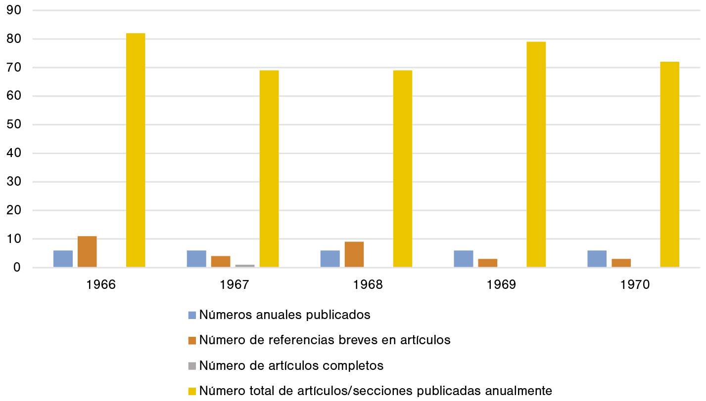 El estudio de la aparición de mujeres en esta revista se ha articulado en varios ejes. Por un lado, se ha examinado uno a uno el número de artículos y secciones de la revista protagonizados por mujeres y destinados a ellas. En este sentido, nos referimos a estudios sobre economía doméstica, las AED del SEA y, en su defecto, la labor de las IDR y de la SF en colaboración con el Ministerio de Agricultura. Por otro lado, se han explorado todos y cada uno de los textos de cada número de esta publicación hasta 1970, inclusive, para detectar las referencias escritas a mujeres rurales, tanto en lo relativo a la propia economía doméstica como a las mujeres de la SF, las IDR. Además, se ha estudiado proporcionalmente la presencia de contenidos para mujeres sobre el total y los propiamente protagonizados por ellas. Por último, se han tenido en cuenta la naturaleza de los artículos, diferenciando, por un lado, los referidos a las AED y la economía doméstica en las agencias comarcales y, por otro, los que aluden a las IDR de la SF. En el aspecto metodológico, y para facilitar los procedimientos de comparación y evolución temporal, el estudio se ha realizado por quinquenios. El primero de ellos abarca desde el primer número de la revista en 1961 hasta la última publicación de 1965. Por su parte, el segundo quinquenio de estudio comprende todos los números que van de 1966 a 1970.