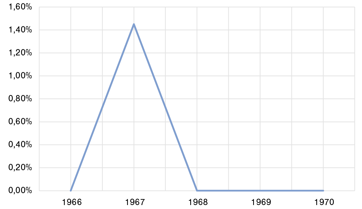 En concreto, la presencia de artículos completos sobre mujeres rurales es prácticamente inexistente en este segundo periodo, como se puede apreciar en la Gráfica 5, así como también es mucho más bajo el número de referencias explícitas. Proporcionalmente, y como se expresa en la Gráfica 6, de 371 artículos y secciones publicadas de 1966 a 1970, tan solo hay un artículo completo sobre mujeres rurales, lo que supone menos de un 0,30% sobre el total.