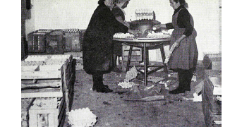 Mujeres trabajando en el envasado de coles de Bruselas para su congelación