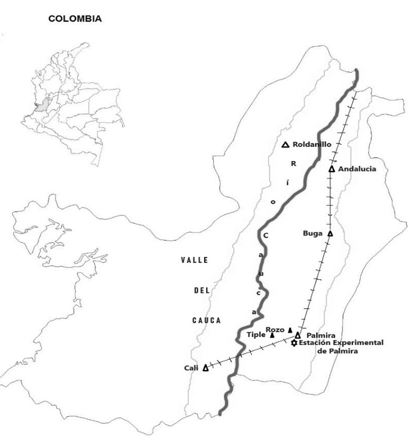 Para realizar el presente artículo se han consultado leyes nacionales, informes ministeriales (Ministerio de Industria y Comercio, Ministerio de Industrias y Ministerio de Industrias y Trabajo), informes del secretario de Industrias del departamento del Valle del Cauca al gobernador e informe de Ciro Durán Castro al secretario de industria del Valle del Cauca y, en especial, los detallados informes consignados en la Revista Nacional de Agricultura, órgano de la Sociedad de Agricultores de Colombia, sobre la estación. Igualmente se tuvo en cuenta una importante bibliografía secundaria que ha abordado, particularmente, cuestiones relacionadas con la estación de Palmira. A este tenor, una de esas expresiones concretas de la revolución verde fue la Estación Experimental Agrícola de Palmira, ubicada en el departamento del Valle del Cauca y en el valle del río Cauca, como se muestra en la Figura 1.